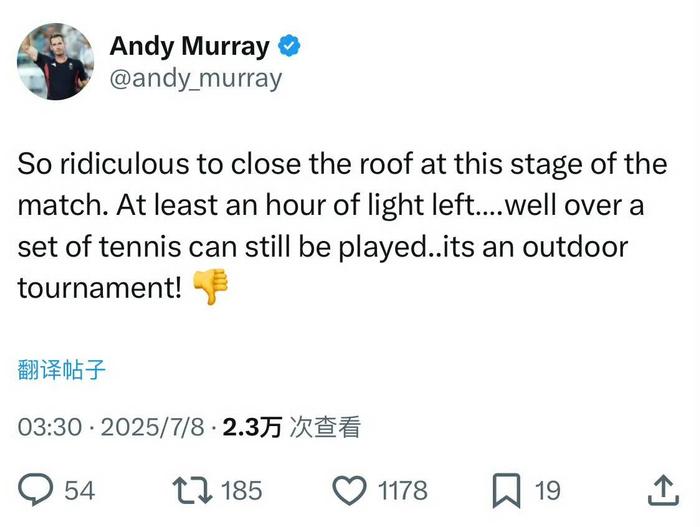 这一决定瞬间点燃舆论。英国名将穆雷在社交媒体炮轰组委会的这一决策:“荒唐!就非要这个时候关闭顶棚吗?至少还能支撑一小时,这明明是一项室外赛事!” 而球迷的质疑更为尖锐,“温网组委会的偏袒太自作多情了吧!这是在为辛纳续命吗?”