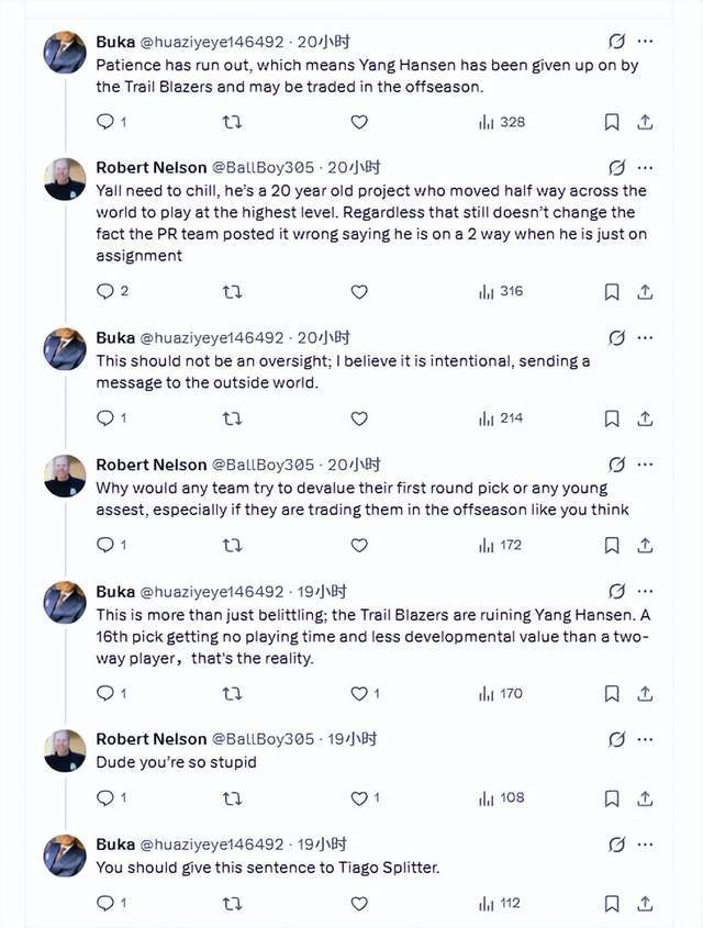 开拓者官方的错误,很快被一位名为Nelson的球迷指出,他写道:“杨瀚森是下放发展联盟,而不是发展联盟双向合同。”随后,一位Buka的球迷与Nelson在评论区展开热议。